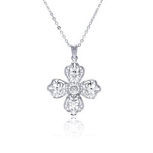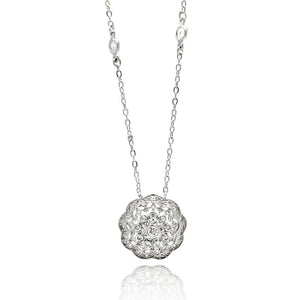 Rhodium Plated Brass Flower Disc Clear Cubic Zirconia Pendant Necklace