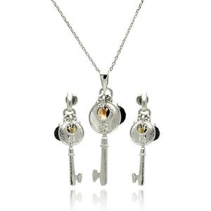 Rhodium Plated Brass Key Pearl Black Cubic Zirconia Dangling Stud Earring & Dangling Necklace Set